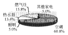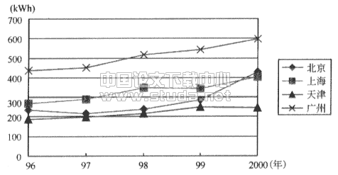 如果把上海调查中"有人即开"对应于美国的"相当多"一项,而把"感觉热才开"和"很热才开"两项对应于"少数白天以及夜间"一项。则可发现,上海的空调虽然普及率高,但应用并不广泛。 从图5可以看出,广州的人均居民用电量一直是四城市中最高的,这明显地与广州空调使用频繁有关。面北京的居民用电量后来居上,2000年超过上海。这可能是由于近年来北京夏季多次出现持续高温,同时北京的居民电价要明显低于上海(0.39元/kWh vs. 0.61元/kWh)。图6是我们调查得到的居民反映家庭能源费用开支最大项目的百分比。  图5 国内四城市人均居民用电量比较  图6 家庭能源消费开支最大的项目(691户) 有待机损失方面,根据美国LBNL在北京和广州157户家庭的调查,平均为37W。上海家庭的家电拥有量与北京和广州基本相同,因此可以认为待机损失也在37W左右。就是说,每个家庭每天有近0.9kWh、每年约320kWh的电是白白浪费掉了。上海全市每年浪费掉的电力达12.8亿kWh,是2000年上海全年用电量的2.3%。