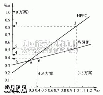 表4中给出六种空调方案,对于每种水环热泵空调系统方案,总有一个ηnh1值使常规空调系统与之相等。利用能耗评价曲线,可以将每种水环热泵空调系统方案折成与之能耗相当的常规系统方案(ηh1轴上)。则易得出:六个空调方案能耗由少到多,依次为6、2、4、5、3、1。