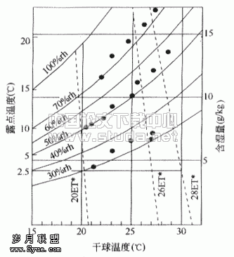 1 引言 随着社会的机械化和化程度日益增加,人们在室内的时间也越来越多(大约占生活总时间的80%以上),这就使人们对室内环境对人体热舒适性影响的研究越来越感兴趣。室内环境是指房间内的所有参数,这些参数会影响人体与周围环境的换热,从而影响人体的热创造性。但是目前,在热舒适性方面所做的研究工作大多数是由美国以及欧洲等一些西方国家所开展的。如今在世界各地所沿用的热舒适性标准也都是根据本文国家所做的研究工作而建立起来的;而各地对这些标准例如ANSI/ASHRAE Standard55-1992的使用并没有考虑不同地区建筑形式的不同、种族的不同等等因素。现在已有一些研究人员对热舒适性标准的普遍适用性提出了质疑。他们认为建筑形式、气候、种族等等因素的差异可能造成世界各地人们在相同的热环境中热感觉不同,对热舒适性的要求也不同。如果在使用热舒适性标准的时候不对其进行一些修正就有可能造成一些不良的后果。因此有必要在各地展开人体热舒适性的研究。然而由于在人体热舒适性的研究领域的起步较晚,到目前为止所做的工作也不多,因此有必要通过测试来确定空气的温湿度对中国热舒适性的影响程度,从而得出ASHRAE的体体热舒适性标准是否适合中国使用,由此可知我们现有的空调房间的设计参数是否合理。 2 实验内容及方法 本次实验采用问卷调查的方式。实验内容为空气温度和湿度的变化对受试者热感觉和热舒适性的影响程度,本实验总共做了18个工况。各工况分布如图1所示。参加该实验受试者数量在200人左右,男女共比例为1:1。实验中受试者的服装为KSU实验室中的标准服装,根据标准此时的衣服热阻值约为0.6clo,在实验时受试者保持静坐状态,此状态下人体的活动量为1.0met。实验惧的数据包括受试者问卷、实验环境中的空气参数(包括空气温度、空气湿度和气流速度)、外界空气参数(包括空气温度和空气湿度)。实验过程中每隔半个小时用TSI在6个均匀分布的测点处对实验小室中的空气流速进行测量并记录,每隔15分钟对温湿度自动巡检仪显示的温湿度进行记录。另外在实验开始、中间和结束时对室外空气参数和玻璃房外的空气参数进行测量并记录。 3 测试结果与分析 本次实验的问卷包括四项主要内容:ASHRAE的七级热感觉标准、四级热舒适标准、受试者对所处热环境的湿度、空气流速以及心情的七级评价指标。另外在分析中采用新有效温度ET*作为热环境的衡量标准。由于受试者的服装热阻并没有进行准确的测量,实际上可能受试者的服装热阻并不正好等于0.6clo,因此实验结果可能有一定程度的误差。  图1 实验工况图 3.1 中性温度与期望温度 中性温度是指在理论上人体感觉最适中的环境温度,中性温度可以分为实测中性温度和预测中性温度[10]。Humphrey[11]指出人们愿意接受的热环境可能在中性温度的这侧或那一侧;在寒冷地区的人们所期望的热环境可能偏向于稍暖和的那一侧,而生活在天气较热的人们的期望温度则可能偏向于较凉爽的一侧。因此期望温度往往并不恰好等于中性温度。从表1的统计结果可看出,期望温度稍低于中性温度,但差别很小,两者基本吻合。女性的中性温度和期望温度要稍高于男性的中性温度和期望温度,但是差别很小,这说明男女所认为满意的热环境基本是相同的,这与Fanger和Nevins等人所得出的结论是一致的。女性之所以喜欢较高一点的温度,可能是因为在一定的活动量下女性单位体表面积的能量代谢率要低于男性的能量代谢率。 中性温度与期望温度 表1 | | 线性拟合公式 | 中性温度(ET*) | 期望温度(ET*) | | 实测值 | 女 | TS=0.3436ET*-8.5758 | 25.0 | 24.9 | | 男 | TS=0.3007ET*7.3769 | 24.5 | 24.2 | | 总体 | TS=0.3198ET*-7.9111 | 24.7 | 24.5 | | 理论值 | PMV=0.3485ET*-8.9052 | 25.55 | |