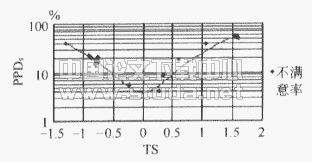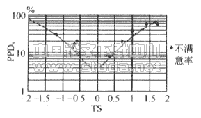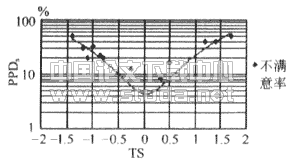 将本次实验的统计结果与Fanger对128名丹麦学生进行实验得出的结果、Nevins对720名美国学生进行实验得出的结果相比较,我们发现本实验得出的中性温度和期望温度要普遍低于Fanger和Nevins所得出的值,其差别约为1℃。这说明中国居民特别是中国的北方居民喜欢较低一点的温度。 3.2 最低不满意率 按照Fanger的PMV与PPD关系的求解方法,从本次实验的结果得出的拟合曲线如图2所示由图中的曲线可以看出实测的最低不满意率LPPDS与Fanger的LPPD值存在着差别,当TS=0时,LPPDS =4%,略低于Fanger的LPPD值(5%)表明实验受试者对环境的不满意程度要比Fanger的值低,中国人对环境更容易满足。从图3和图4我们可看出女性的LPPDS =4.3%,男性的LPPDS =4%,女性和男性对环境的不满意率基本上是一样。  图2 TS与LPPDS关系图  图3 女性TS与LPPDS关系图  图4 男性TS与LPPDS关系图 3.3 舒适区的确定 由Fanger教授统计分析的PMV-PPD关系以及ASHRAE Standar 55-1992的舒适区可知在舒适区的确定原则是使80%的人满意。Fanger教授通过统计得出:当PPD=10%时,PMV=±0.5,当PPD=20%时,PMV=±0.85。经统计换算本实验满意率为80%、90%时的ET*范围见表2。 舒适区的确定 表2 | 分类 | 线性拟合公式 | 90%不满意率(ET*) | 80%不满意率(ET*) | | 实测值 | 女 | TS=0.3436ET*-8.5758 | 23.5~26.6 | 22.5~27.7 | | 男 | TS=0.3007ET*-7.3769 | 23.3~26.2 | 21.2~27.2 | | 总体 | TS=0.3198ET*-7.9111 | 23.0~26.5 | 22.1~27.5 | | 丹麦学生 | TS=0.3048ET*-7.8360 | 24.1~27.3 | 23.1~28.5 | | 美国学生 | TS=0.3376ET*-8.6250 | 24.1~27.0 | 23.0~28.1 |
