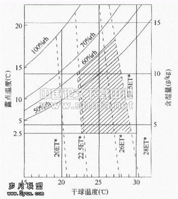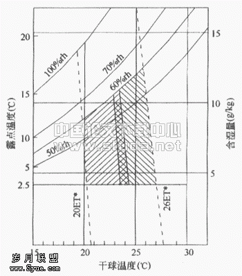 将该实验结果与Fanger和Nevins等人的研究结果作比较发现本实验得出的中国人满意的温度的下限比Fanger得出的西方人满意的温度的下限要低1℃左右,而上限值也比西方人低0.7℃左右,两者舒适区的宽度差不多。 在本实验数据处中舒适区相对湿度上下限的确定采用ASHRAE Standard 55-1992中的标准。图5给出了本次实验的80%满意率舒适区,同时并给出了ASHRAE Standard 55-1992的舒适区(图6)以作比较。通过对比我们可以发现本次实验所得的舒适区的上限值要比ASHRAE Standard 55-1992中舒适区的上限值高1.5℃。  图5 80%舒适区  图6 ASHRAE Standard 55-1992舒适区 4 结论 通过对实验数据的处理,可以得出以下结论: (1)中性温度为24.7℃,期望温度稍低于中性温度,但差别很小,两者基本吻合。女性的中性温度和期望温度要稍高于男性的中性温度和期望温度,但是差别也很小,这说明男女所认为满意的热环境基本是相同的。 (2)当TS=0时,LPPDS=4%,略低于Fanger的LPPD值(5%),表明中国人对环境更容易满足。这可能是由于受我国因素以及人体的心理适应性等因素的影响。 (3)中国人80%满意率的温度范围是22.1ET*~27.5 ET*,比Fanger和Nevins等人的研究结果低1℃左右,两者的舒适区宽度差不多。由于在实验中受试者的服装热阻并没有进行准确的测量,可能造成实际上受试者的服装热阻不等于0.6clo,由经造成实验结果一定程度的误差。 (4)与ASHRAE Standard 55-1992中的舒适区相比本次实验所得的舒适区要比ASHRAE Standard 55-1992中的夏季舒适区的上限值高1.5℃。 (5)在空气调节设计规范中规定舒适性空调室内设计参数为[12]: 夏季:24~28℃ 相对湿度 40%~65% 冬季:18~22℃ 相对湿度 40%~60% 将设计参数与本实验得出的舒适区比较,认为我国现有的空调房间的空气设计参数基本合理。