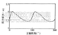图6为气体形成的阻力矩随主轴转角的变化曲线,从图中可以看出,该曲线的变化周期为π;阻力矩的波动幅度较小,约为0.5N·m。另一方面,该转缸机构无往复运动件,旋转惯性力可以完全平衡。这样可使转缸旋转压缩机的振动保持在较低的水平上。