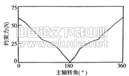 图7 示出滚动活塞与气缸之间的约束力随主轴转角的变化。从图中可以看出,该约束力在0~60N之间波动,其值相对较小。另一方面,滚动活塞与气缸之间为滚动线接触,因此在处理R410A时的磨损会较小。