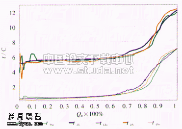 3/h左右,下进上出,无搅拌。3个取冷过程的取冷时间分别为10.5,8.7,5.3h,从而总取冷量分别为7.91,6.65,4.05kJ,分别占设计容量的125%,105%,64%。以各自的取冷率Q