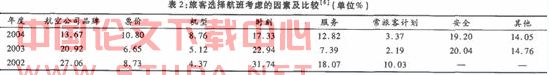 从横向看,我们可以知道在各类影响因素中,机票价格只排在第 5位(不考虑其他因素),消费者更看重航空公司的品牌、航班时刻、服务和安全。对于安全因素,我国的航空公司都可以最大限度的保证旅客的生命财产安全,而对于其他的三个因素,则存在很大的不同。特别是航班时刻是最重要的影响因素,这就决定了航空公司不可能提供完全同质的产品如果再考虑航空公司的品牌和服务,那么非价格因素对旅客购票的影响才是主导因素。但从纵向看,从 2002年到 2004年,机票价格对旅客的影响越来越大,其他的因素越来越弱这说明非商务旅客的比例增加,他们更注重机票价格,而忽略公司品牌和时刻。这便导致公司对机票价格竞争的加剧,使价格因素和非价格 因素变得 同等重要 。