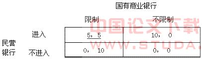 当国有商业银行的竞争者还未出现的时候,处于垄断状态(我们暂且不考虑一直存在的地下或半地下的民间金融),国有商业银行可以高枕无忧,即使资金的价格即利率很低,仍然不必担心储蓄者改变策略不来储蓄。但是当竞争者如民营银行出现的时候,问题就出现了。储蓄者可以选择不到国有商业银行储蓄,而到民营银行储蓄,其仍然可以受益(并且收益大于零)。则原有的纳什均衡被打破了,储蓄者一定不储蓄,不论国有商业银行吸纳还是不吸纳,即(吸纳,不储蓄)和(不吸纳,不储蓄)是新的纳什均衡。