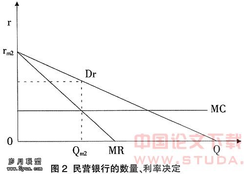 图2中民营银行的需求曲线的弹性大于国有商业银行的需求曲线弹性,因为民营银行的市场化程度较为深化,利率的较小变化便会引起贷款数量的较大变化。同样,按照MR=MC的原则确定的贷款数量是Qm2,利率是rm2。一般来说,在发展中国家Qm2的数量大大小于Qm1的数量。