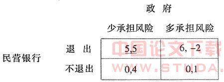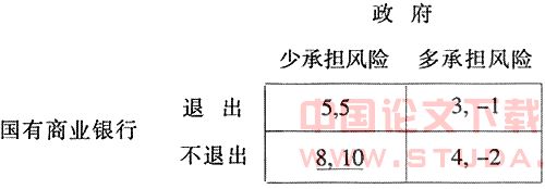 下面用一个简单的矩阵对国有商业银行和政府之间关于退出与承担风险的博弈进行分析。两个博弈主体是国有商业银行和政府。对于国有商业银行有两种策略:退出和不退出;对于政府而言也有两种策略:少承担风险和多承担风险。对于政府而言,少承担风险的收益要严格大于多承担风险的收益,这是优超战略。而国有商业银行选择退出的收益必然少于不退出的收益。之所以收益不为零,是因为退出并不是所有的国有商业银行退出,而是部分国有商业银行退出,其总收益相对于不退出只是减少而已。因此(不退出,少承担风险)是最终的纳什均衡。