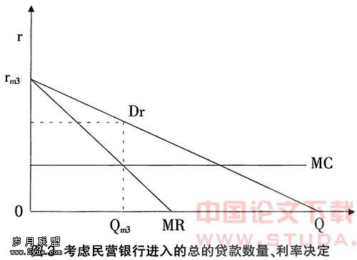 图3是考虑了民营银行进入的总的贷款数量的利息率的情况,需求线的弹性介于国有商业银行和民营银行需求弹性之间,按照MR=MC的原则,民营银行的贷款数量和利率分别为Qm3和rm3,并且Qm3=Qm1+Qm2,rm3<Rm1。由此可见,民营银行的市场进入使得利率降低贷款数量增加,对与资金的资源配置而言是优化了,实现了帕累托改进。
