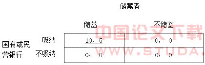发展中国家通常存在金融抑制和投资抑制的经济现象,这是传统经济体制或目前经济体制转轨的一种显性表象。国有商业银行附带着的是国家或政府的利益,它并不是以利润最大化为惟一目的,还控制资本的流向,并在宏观上体现政策制订者的意向。国有商业银行想拥有大量的资金形成资金需求,而储蓄者又对国有商业银行有着国家信任存在大量的资金供给,供求相等或略有差异都会出现基本均衡(注:银行业还应当包括城市商业银行、城市信用社和农村信用社,它们的改革可以形成民营银行的增量,因此它同组建民营银行有着同等的功效,将之并入民营银行的增量,不再单独考虑,以简化理论分析。),而事实上,国有商业银行对资金的需求是极大的或无限的,而在基本封闭的经济环境中资金供给是有限的,这在短期内也存在着一种均衡。这就是国有商业银行一定吸纳资金,储蓄者对国有商业银行实行资金供给的纳什均衡(吸纳,储蓄)。