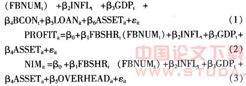 从现有文献看,相关研究可分为两类,第一类是检验跨国影响,第二类是集中研究外资银行进入对单个特定国家的影响,二者通常使用的都是对单方程的简单回归。因变量一般是成本效率、盈利效率、贷款活动以及贷款质量这样一些指标,以从不同角度考察银行绩效。而自变量由外资银行进入指标以及可能影响银行的其他控制变量组成,包括银行特定指标向量和宏观经济变量向量等,实证回归模型可以表示为: