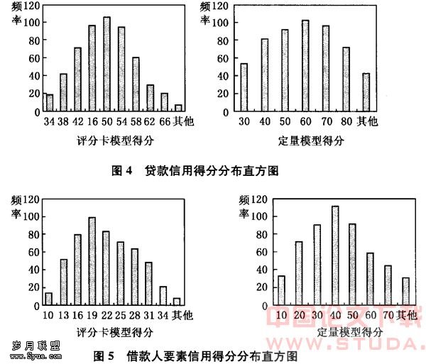 为此,我们从某股份制商业银行收集了544笔有效的个人住房贷款数据,然后用所构建的个人住房贷款信用评分卡模型和定量模型对这些贷款分别进行评估,最后以直方图的形式来表达所有贷款信用得分的分布(见图4和图5)。从图4和图5可以看出两个模型的评估结果都呈现出一种近似正态的分布,这符合我们的期望,反映了两个模型能够对贷款的风险水平做出明显的区分。