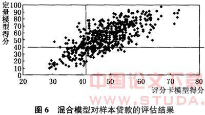 在设定评分卡模型和定量模型的接受临界值为40的情况下(实际使用时要根据各模型的实际表现和银行信用政策来加以具体确定),混合模型对样本贷款的评估结果显示在图6中,对照示意图3可以看出,在大多数情况下评分卡模型和定量模型的评估结果是一致的,此时可直接做出接受或拒绝的信贷决策,只在少数情况下评分卡模型和定量模型的评估结果产生差异,此时需要人工干预来做出决策。