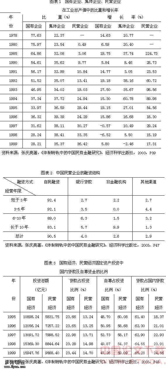 1.从制度需求角度看,民营银行是民营经济发展的内生性金融制度需求。改革开放以来,中国的民营经济得到了迅速的发展,图表1表明了改革开放后民营经济发展的状况。从中可见,民营经济的发展基本保持平稳上升的态势,其增长率均高于同期国有经济及集体经济的增长率,民营经济已逐步发展为中国经济结构中重要的一极。但是,民营经济所获得的银行融资比例同它对GDP的贡献率极不相称,从图表2和图表3可以看出,银行贷款的绝大多数流向了国有经济,民营资金来源中银行间接融资比重极低,内源性融资是中国民营企业的主要融资方式。目前,有80%的民营企业认为融资困难已经严重阻碍了其正常的发展(张庆亮,2003)。这说明现有的金融制度安排无法满足民营经济发展的资金需求,这主要是由于:(1)国有银行特殊的产权结构和官本位制度决定了其受政府干预较多,服务对象集中在国有企业。(2)作为民营经济微观主体的多是中小民营企业,由于社会上缺乏统一的评信体系,国有银行与之交易的费用较高。