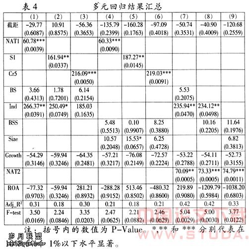 为避免解释变量之间的多重共线性问题,我们先了各个解释变量之间的相关系数。表3的结果表明,除了股权结构的三个变量和地域性虚拟变量之间的两两相关系数较高以外,只有董事会与监事会规模两个变量之间,以及银行规模和董事会独立性两个变量之间的相关系数较高,其余变量之间的相关系数都比较低。