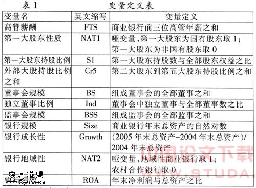 为了量化考察高管激励,我们选择商业银行前三位高管薪酬作被解释变量,选取了包括股权结构、董事会、监事会和控制变量在内的10个指标。第一大股东性质、第一大股东持股比例和外部大股东持股比例,作为经典的股权结构变量已纳入我们的研究范围;董事会方面,选取了衡量董事会规模和董事会独立性的两个变量,分别用董事人数和独立董事比例予以刻画;监事会规模作为衡量银行监督能力的指标也纳人了研究范围。控制变量方面,本文主要选取了商业银行规模、成长性、地域性和银行绩效四个指标。变量的详细定义参见变量定义表。