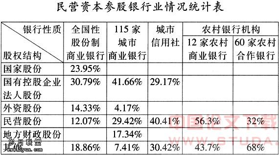 民营资本参与中国银行业已是大势所趋。自2002年到2005年,11家全国性股份制商业银行股权结构发生了重大变化,民营股本增加了65.54亿股,增长144.9%,民营股占比增长了1.24%,而同期国家股、国有控股企业法人股占比分别下降了0.76%、17.19%。民营资本已占民生银行总股本的55.04%。
