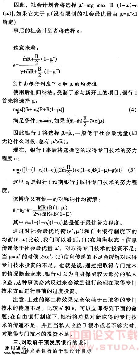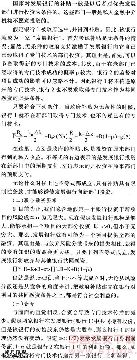 从上述模型中,我们可以得到以下几点结论:一是在自由银行制度下,商业银行对的长期融资不足,并且对于长期投资的专门技术相互之间的传递不够。由政府支持的银行可以减轻这些问题,但是完全依靠政府支持是不够的。只有在满足一定的条件下,政府发起的效率才会提高。其中关键的条件是发展银行干预的目标确定、联合融资安排和(或者)与私人机构的合资等。二是社划者对发展银行的干预,是通过把补贴建立在限定范围的基础之上,也就是说,政府对农业的补贴是通过发展银行提供的定向贴息贷款实现的。因此,政府对发展银行具体的运作是不加干预的。三是健全的银行体系是保证发展银行得以存在和发展的必要条件。[3]作为市场最重要的主体之一,自由商业银行体系的存在是发展银行得以存在和发展的前提。没有健全的商业银行体系作为后盾,政策性银行的功效就发挥不出来;政策性银行的市场定位在于商业银行不愿意从事的中介业务,而不是取而代之。四是发展银行本身的治理结构必须是完善的,对发展银行经理的激励约束机制十分有效,才能够保证专门技术的有效及时传递。五是联合融资安排和与私人金融机构的合资是保证专门技术得到有效传递和扩散的先决条件。另外,通过联合融资安排和与私人金融机构的合资,还可以达到提高政策性金融中介融资效率的目的。
