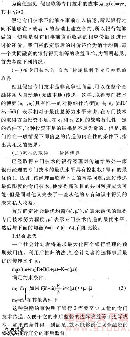 假定有2个银行,其经理必须对是否在新部门投资做出决策。假定在新部门的任何投资可分为两期:在t=1期间,必须首先得到专门技术,在融资/监督的t=2期间末,投资的收益为R∈[0,R]。