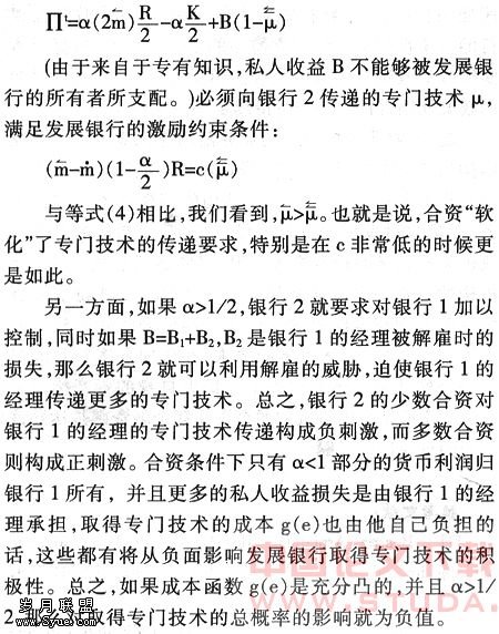 还可以看出该模型存在的不足之处:一是德阿亚恩模型是在一般均衡框架下分析政策性银行的效率问题的,一般均衡分析的框架并不符合发展家经济的具体特征。因此,在接受其政策建议方面应该十分注意结合我国的具体国情,不能够盲目全盘照收。二是德阿亚恩模型中,技术的传递完全依赖于发展银行和商业银行两个主体之间的双重博弈关系。社会计划者的引入,只不过说明了在自由银行体制下专门技术的传递不足问题,而不是新的博弈者。当然,现实中农业发展银行在贷款的发放和监督方面,相关的利益主体绝不是如此简单。比如,农业发展银行对粮食企业贷款的过程中,由于存在着代理关系,粮食企业、农业发展银行和农业银行(信用合作社)之间的交叉多重博弈就是必然的结局。所以,在应用该模型的结论时,必须注意博弈主体的变化。三是在国有银行占主导地位的金融体系中如何实现联合融资安排和私人金融机构的合资问题,是我们必须面对的现实。我国的金融体系是国有银行占垄断地位的非竞争体系。按照德阿亚恩模型的逻辑,政策性银行与商业银行(私人金融机构)的联合融资安排和合资是改进政策性银行经营绩效的重要途径。那么在我国的具体国情下,如何通过联合融资历和合资来解决政策性银行的效率问题,仍然没有明确的答案。
