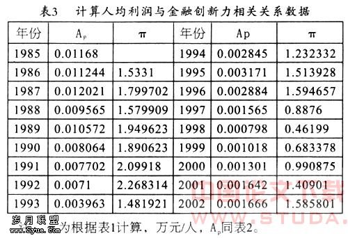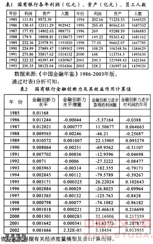 根据表1提供的历年我国国有银行金融资产、从业员工、利润合计数,以及有关度量模型,我们可以得到国有商业银行金融创新力的有关经济计量值,见表2。