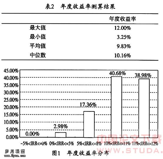 2. 产品数据测算。产品历史数据均来自Bloomberg。测算的方法是:2002年8月19日为第一个起始日,2002年8月20日为第二个起始日,依此类推,得到2006年3月23日为最后一次测算的起始日,则2007年3月23日为最后一次测算的到期日。样本总数为939,即该产品经过939次历史数据测算,其人民币产品的测算结果如表2所示(以人民币产品为例),该产品年度收益率分布如图1所示。