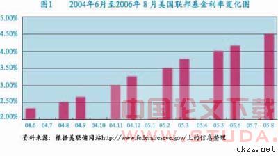 在金融管制放松和利率市场化的条件下,利率风险几乎无时无处不在。利率风险准确地说是一种不确定性,类似商品价格随市场情况而发生的波动,既有可能给金融带来损失,也有可能带来收益。美元利率自2004年6月起升息10次,隔夜拆款利率自2.25%至4.50%(见图1)。与此同时,我国人民币的利率也做了相应调整,从1.98%小幅上升到2.25%(见表1)。可以断言,伴随着我国按照先外币后本币、先贷款后存款、先大额后小额、先后城市、先市场后信贷的步骤实施的利率市场化改革的推进,我国人民币利率调整的次数将增加,同时商业银行的存贷款定价要紧紧面对市场,存贷利差将进一步缩小,银行间竞争加剧,商业银行将直接面对利率的波动对营业收入造成的影响。(见图1)