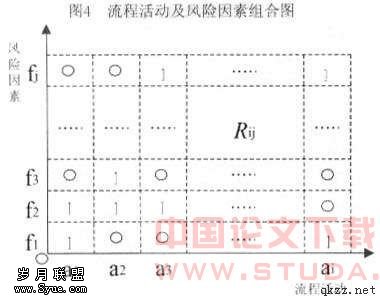 图4中,横坐标为关键流程活动,纵坐标为风险因素。图中取1的为关键流程活动与风险因素的有效组合,取0表示该组合无效。例如组合(a2, f1)表示在流程活动a2中,风险因素f1不起作用。对于有效组合,可以进行衡量或评估以确定该组合下的风险损失Rij。如果确认了银行业务中的所有关键流程活动ai和风险因素fj,那么就可以得到一个关键流程活动/风险因素组合有效性矩阵,在该矩阵中,有效组合取值为1,无效组合取值为0。