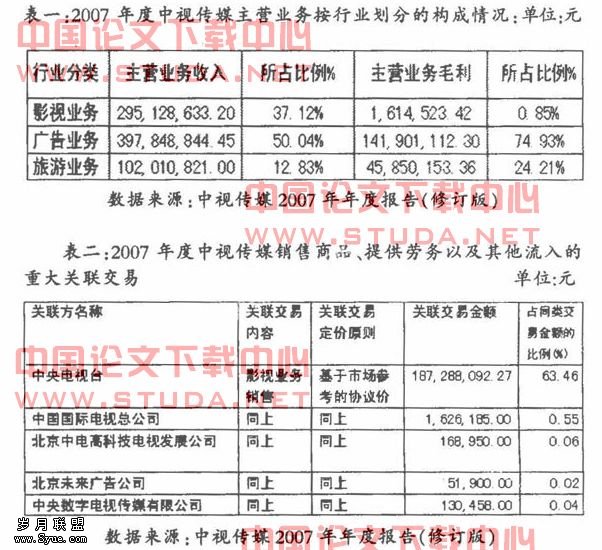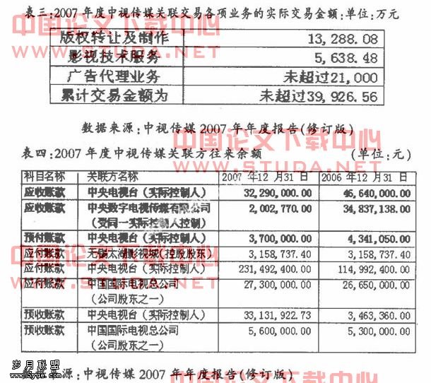 2005年中视传媒向CCTV影视业务销售仍达到13808.987万元。占同类交易额的66.39%;与国际电视总公司之间的影视业务销售合计54.26万元,占同类交易额的0.26%。也即其影视剧目66.65%靠内销。2006年中视传媒与CCTV之间的影视业务销售合计149110059.50元,占同类交易额的46.39%;中视传媒向中国国际电视总公司影视业务销售合计488043.57元,占同类交易额的0.15%,中视传媒向中央数字电视传媒有限公司影视业务销售合计69857538元。占同类交易额的21.73%:也即其影视剧目64.13%靠内销。2007年中视传媒与CCTV之间的影视业务销售合计18728.8万元,占同类交易额的63.46%;中视传媒向中国国际电视总公司影视业务销售合计1626185元占同类交易额的0.55%,另外还有0.12%的影视业务销售属于关联交易;也即其影视剧目68.27%靠内销(如表二所示)。果然,被人言中“中视传媒短期内似乎无法摆脱关联交易的诱惑。”。