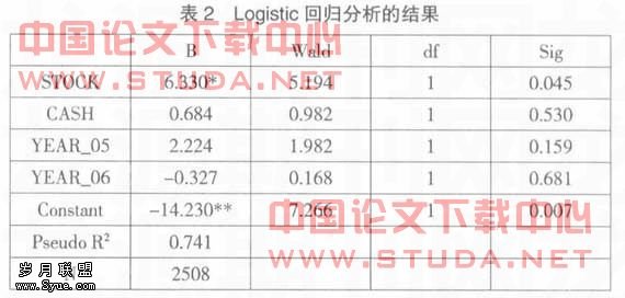 Logit(Y)β0+β1×CASH+β2×STOCK+β3×YEAR_05+β4×YEAR_06+ε