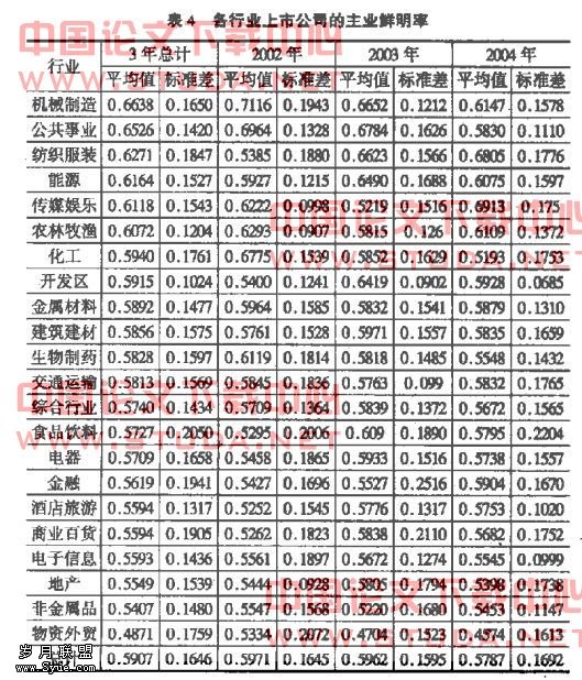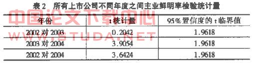 从表2中看,2002对2003年的t统计量小于95%置信度的临界值,因此,这两年之间主业鲜明率的平均值没有显著差异。而2003对2004年及2002对2004年的t统计量均大于95%置信度的临界值,所以,2003与2004年之间及2002与2004年之间主业鲜明率的平均值是有显著差异的。这说明2003年比2002年主业鲜明率的下降是不明显的,但2004年比2003年主业鲜明率的下降是显著的,说明表1中主业鲜明率的下降趋势是存在的。这在一定程度上肯定了假设,即上市公司多元化程度有一定程度的上升趋势。