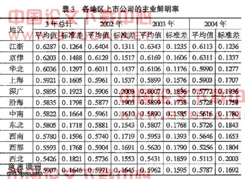 不同地区的在经营风格上应该有所不同,所以不同地区的企业在多元化程度上也会有所不同,反映在主业鲜明率上,不同地区也应不同。在分析中划分为江浙、京津、华北、上海、深广、沿海、中南、东北、西南、西部和西北11个地区,不同地区上市公司的主业鲜明率的统计见表3。表中地区是按主业鲜明率平均值从高到低的顺序排列的。标准差最小的是江浙地区,为0.1264,最大的是深广地区,为0.1923,某地区标准差小表明该地区内主业鲜明率的差异程度较小,比较集中,而标准差大表明地区内的主营业务鲜明率的差异大。