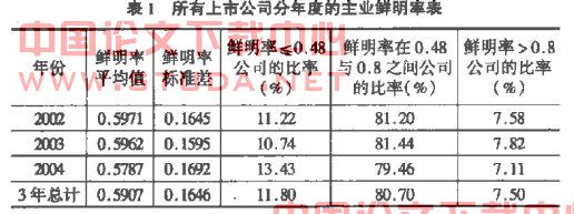 为分析上市公司的多元化程度是逐年变化,表1中列出了全部公司3年总计以及2002、2003和2004年的主业鲜明率的统计结果。