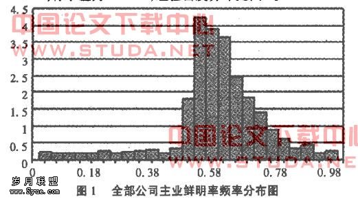 进一步分析可知主业鲜明率在0.48到0.8之间的占80.7%,小于0.48的占11.8%,大于0.8的占7.5%。从这一结果可知上市公司的主业鲜明率普遍在0.48以上,在此范围内的上市公司占到了88.2%。这说明上市公司普遍对主业非常重视,真正多元化程度达到很高的公司并不是太多。