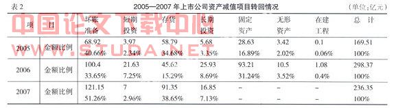 表2反映的是2005年、2006和2007年转回各项减值准备金额的比例关系。从表2中可以看出,2005年转回金额排在前三位的资产减值准备分别是坏账准备、存货跌价准备和固定资产减值准备,分别占整体的40.66%、34.68%和16.89%;2006年转回金额排在前三位的减值准备和2005年也是坏账准备、固定资产减值准备和存货跌价准备,分别占整体的33.65%、31.24%和15.25%。但是转回的固定资产减值准备占整体的比例却大幅度提高,由2005年的16.89%上升到2006年的31.24%,增长了14.35%,转回金额仅次于坏账准备,位于第二位。转回的无形资产减值准备占整体的比例也有提高,由2005年的2.02%上升到2006年的3.52%,增长了1.4%;2007年转回金额排在前三位的资产减值准备也分别是坏账准备、存货跌价准备和长期投资(只包括长期债权投资)减值准备,分别占整体的51.26%、38.65%和7.13%,转回的坏账准备比2005年增加了10.6%,这种变化的主要原因是2006年发布的新资产减值准则中明确规定:资产减值损失一经确认,在以后期间不得转回。这一规定主要包括固定资产、无形资产、在建工程和部分长期投资等长期资产。部分资产因为后续计量是以公允价值计量的,不计提减值准备,除了可供出售的资产是例外;有些资产减值是可以转回的,包括存货、应收款项、长期债权投资、递延所得税资产等。这意味着自2007年1月1日准则实施起,上市公司以往年度计提的固定资产减值准备、无形资产将不得冲回,这对上市公司的利润将产生很大影响。因此2006年被视为资产减值准备冲回的最后期限,上市公司在过去年度通过种种理由计提的资产减值如果不及时转回,将彻底成为沉没成本。2006年固定资产减值准备转回金额所占比例的大幅度提高也验证了这一点。