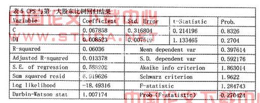 5.股利支付率因第一大股东比例的不同而存在显著差异。表5是基于第一大股东比例的股利政策单因素回归分析的结果。表5显示,每股现金股利的F值虽然大于1,但P值未通过显著性检验,即第一大股东身份未导致样本公司每股现金股利之间的显著差异。股利支付率单因素方差分析的F值大于1,且P值通过了显著性检验,说明第一大股东身份在99%的置信水平下对股利支付率产生显著影响。 三、股权结构与股利支付率关系的回归结果分析
