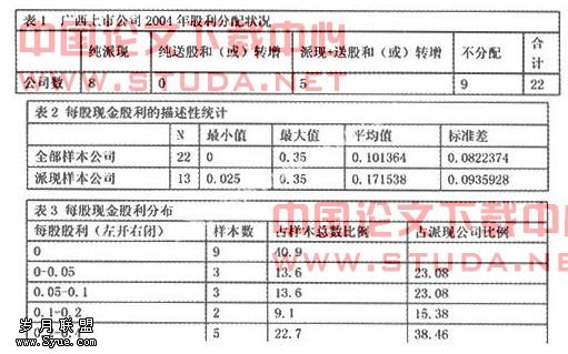增)三种。广西上市公司的股利分配状况如表1所示。样本公司的描述性统计分析表明,2004