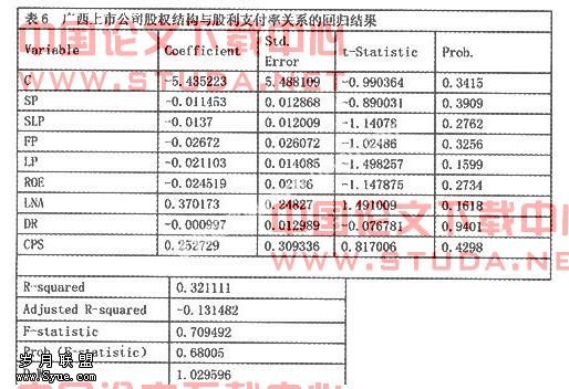 回归结果显示,广西上市公司的国家股比例、国有法人股比例、境内法人股比例、流通股比例都与股利支付率成负相关关系。规模(资产的对数)、每股经营现金流量与股利支付率存在正的相关关系,净资产收益率、资产负债率与股利支付率负相关。由t检验结果可知,广西上市公司股权结构变量与股利支付率的相关关系不显著,可能是受以上其分配特征影响。净资产收益率与股利支付率的关系和一般经验不符,这表明了广西上市公司特殊的股权结构对其股利政策的影响。并且由于样本的总数量较少(仅22家),某一家的数据对结果的影响较大,如将600252这一股(股利支付率最高而净资产收益率最低)去掉,净资产收益率与股利支付率显示正的相关关系。