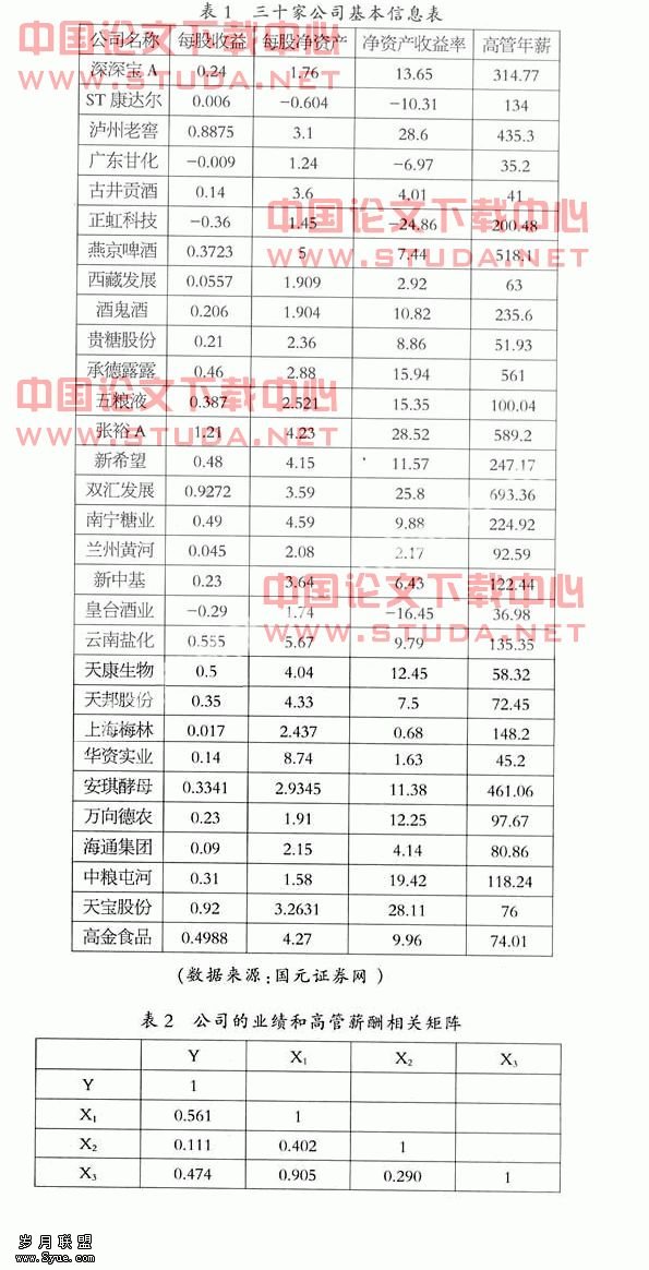 本文实证研究部分采用了中国上市公司资讯网提供的“食品饮料类”上市公司数据,从中选取三十家公司。在酒精及饮料酒制造业、粮食及饲料加、制糖业、软饮料制造业、食品加工业、屠宰及肉类蛋类加工业、盐加工业、罐头食品制造业各选取一定的样本,同时避免在某个局部行业、局部地区抽样太多,造成样本分布不合理,失去公允性。 而描述公司业绩的变量主要来自于上市公司年报。本文选取了每股收益、每股净资产、净资产收益率三个指标来考察公司盈利能力和能力。高管所持股票和期权的收入由于无法准确统计,且股票的价格受到的影响因素很多,如国内外形势、行业形势,宏观调控等等,一时难以给予合理的定价,同时很多公司尚未采用持股和期权激励方式,虽然可能会造成一定的误差和不合理之处,但影响不大,故暂不将其考虑在薪酬范围之内,不记入年薪中。