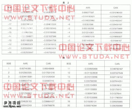 依据上面的收益率方程计算出正常收益率,并依此计算异常收益率和最终的累计异常收益率,计算出的样本平均异常收益率和累计平均异常收益率数据如表2、表3。