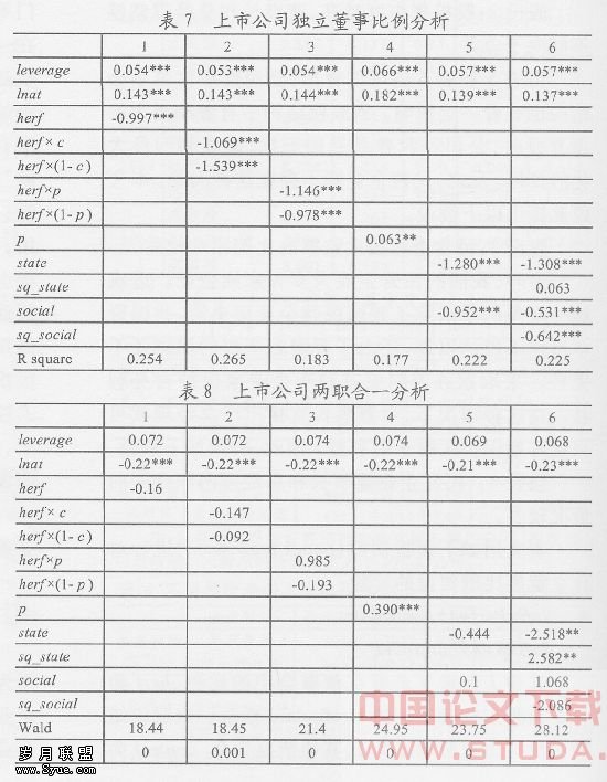 以上结果说明了一个有趣的但又被人忽略的现象:股权集中与否和股权性质对公司治理的影响并不是非此即彼的。有助于提高独立董事比例的因素往往同时推动着两职合一,反之亦然。