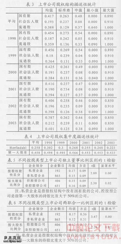 本文所使用的数据来自北京色诺芬信息服务有限公司与北京大学中国经济研究中心合作开发的CCER中国证券市场和公司治理数据库。本文以1998-2003年沪深两市1267家上市公司作为研究对象。剔除了股权结构数据不全或者明显有误的数据,最终样本公司数量为1057家。