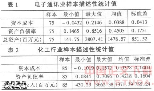 以上两张反映电子通讯和化工行业样本描述性统计值表在许多方面具有相似性。首先,我国上市公司的资本加权成本不是很高,平均资本加权成本最高为3.88%;其次,上市公司具有较高的资产负债比率,资产负债率的均值超过40%,上市公司对债务的依存度较高;最后,上市公司在资本成本以及资产负债比率方面具有较大的差异。