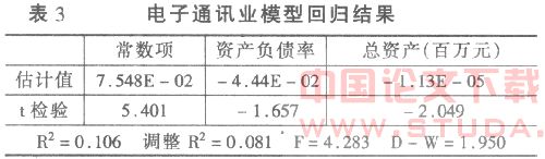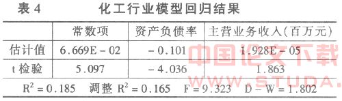 依据加权资本成本的模型进行回归,其中,电子通讯行业样本公司的企业规模采用总资产表示,而化工行业的企业规模用主营业务收入表示。最终得到的回归结果列示于表3和表4。