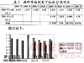 2000年3月16日,经国务院批准的《中国证监会股票发行核准程序》(以下简称《程序》)颁布实施,标志着核准制的正式实行。由于《程序》规定拟发行股票的公司在向中国证监会报送申请材料前,须接受其主承销商一年的辅导,因此,实行核准制后第一家上市的公司的上市时间为2001年。鉴于此,本文将上市公司区分为2001年以前上市的公司及2001年后(含2001年)上市的公司。前者为实行审批制时发行上市的公司,后者为实行核准制后发行上市的公司。根据前述托宾Q值计算公式,计算出每个样本上述各年度12月31日的托宾Q值,将同一时点实行审批制时发行上市的公司的托宾Q值进行算术平均,得出该年度末此类公司的平均托宾Q值。同理可计算出各年度末实行核准制后发行上市的公司的平均托宾Q值。计算结果见表1: