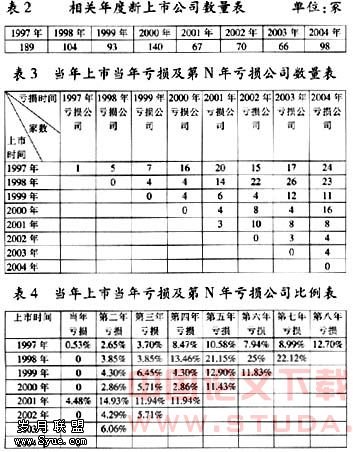 为了对上述计算结果进行验证,本文选取了上海证券交易所和深圳证券交易所1997年至2004年各年的新上市公司为样本(见表2),分别统计出其上市当年及后续年度的亏损家数(见表3),并计算出亏损公司所占比例(见表4)。通过比较可见,2001年上市的公司在上市当年及后续年度亏损的比例最大,2002年及2003年上市的公司亏损比例也较高。这也在一定程度上验证了关于市场价值的计算结果。