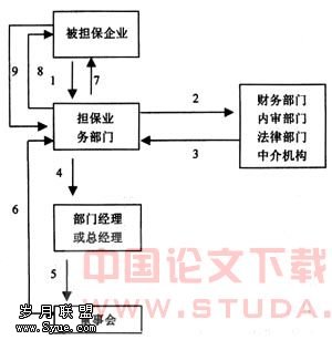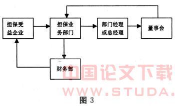 图3当被担保企业无法偿还到期债务,由于担保企业负有连带偿还责任,担保受益企业要求担保企业偿还债务;担保业务部门把担保受益企业的求偿要求提交给部门经理或总经理;部门经理或总经理再把索赔通知和担保合同提交给董事会进行决策;董事会把经过集体决策的意见传达给担保业务部门;担保业务部门将董事会决策意见转交财务部门,财务部门再会同法律部门和担保业务部门向担保受益企业支付款项。