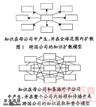 2. 跨国公司的知识获取和整合模型。关于跨国战略的最新观点认为,跨国公司不仅是在海外利用母国的知识,而且还是整合位于世界不同地方的知识的“车轮”。这一观点认为跨国公司的知识基础是企业通过自己的研发部门内部创造的知识和从外部获得的知识的结果。知识不仅仅从母公司获得,也可以从该跨国公司从事经营的海外子公司获得。如果视跨国公司为一个分散的,则它可以通过在跨国范围内平衡知识而取得优势。这种关于跨国整合知识的观点可见于Derlmutter(1969)的“地理中心化企业论”中,Bartlett和Ghoshal(1989)的“转移论”中,以及Hedlund(1994)的“超层级组织论”中。图2描述了跨国公司获取、整合和平衡知识的模型。