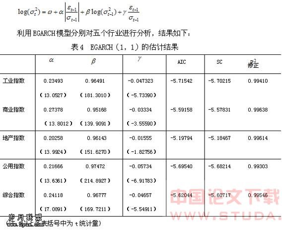 第二,EGARCH(1,1)模型拟合的行业指数中除地产行业外 都显著,既除地产行业都存在明显的“杠杆效应”。