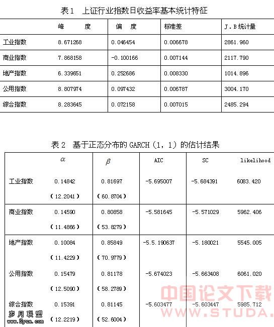 两种分布下的五个行业估计的 值都非常接近1,说明沪市各行业都存在波动的积聚性和持续性。从AIC准则极大似然统计量上可以看出基于t分布GARCH(1,1)模型比基于正态分布的模型在拟合能力上有所提高。